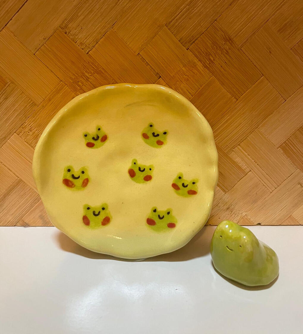 Germayne took inspiration from artists on Instagram such as @wawestudio and @theforestmori, whose works feature a simplistic yet charming design which contrasts the more traditional intricate pottery works. The design incorporates cutesy illustrations of frogs in pastel colours, giving it a cheerful feel.