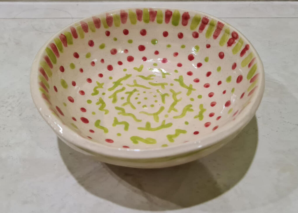 Hanisah, inspired by the vibrant colours of a watermelon, utilised the colours crimson red and pear green, in the design on the bowl. The design provides a new, more refreshing feel in contrast to the typical shape of a bowl
