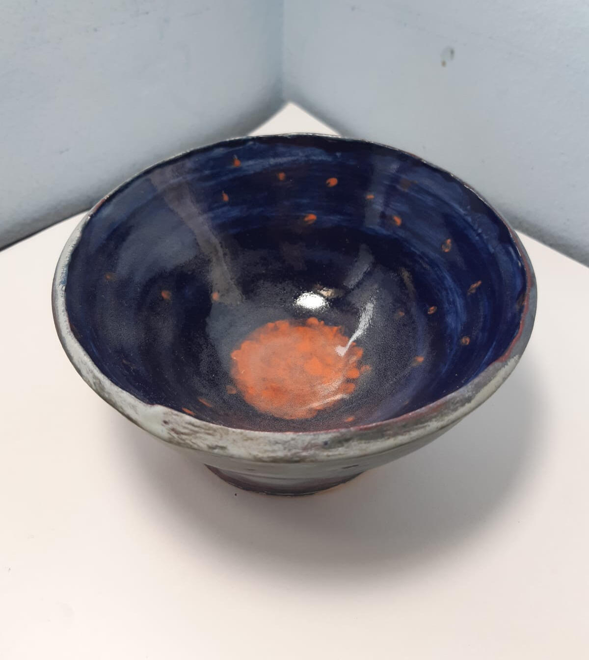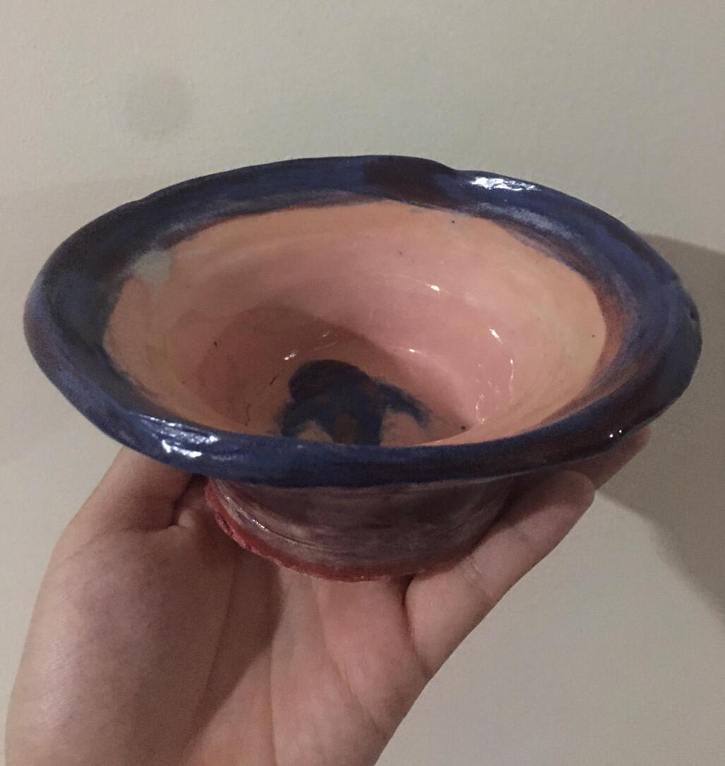 Vera crafted this piece with the intention of creating a delightful dessert bowl, which livens up the user’s everyday life. Her colour palette consists of a soft blush colour, contrasted with bold indigo. An especially unique feature would be the Koi fish painted at the bottom of the bowl, which reveals itself as the user finishes their dessert. This evokes serene images of Koi ponds, imbuing a sense of calm in the user. This elevates one’s dining experience, and would surely leave an impression on the user.