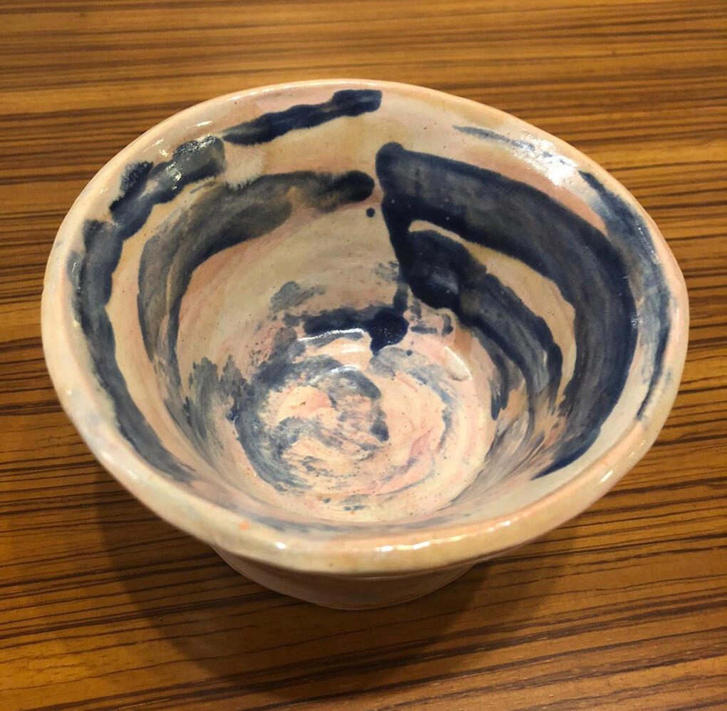 Wan Ying allowed herself to be in tune with her feelings when creating her artwork. The deep blue swirls of differing thickness and length were painted on to contrast the peachy pink colour of the bowl. The dominant pink colour of the bowl portrays unconditional love, which envelopes the blue colouration that represents trust and peace. In her work, Wan Ying demonstrates that tranquility can be achieved through affection for those she truly cares about.