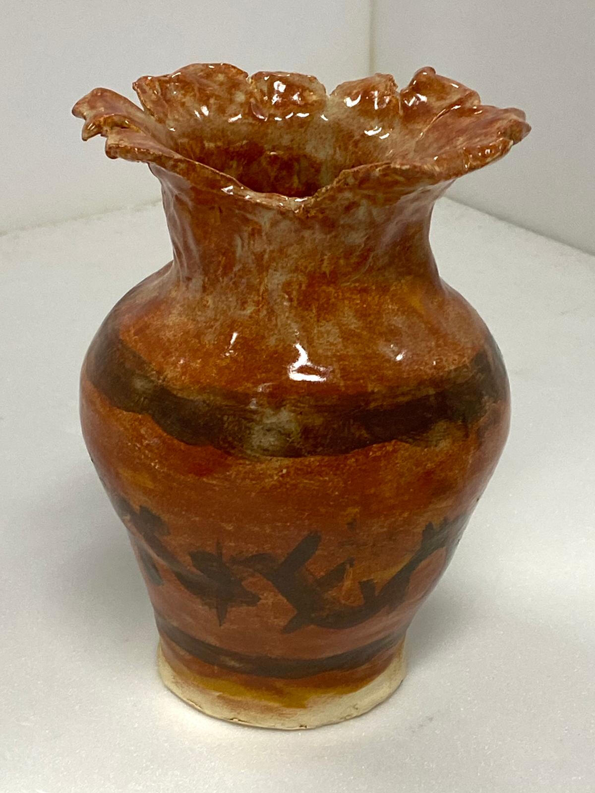 Caleb’s core design is based on classic Greek pottery with a brown backdrop and dark and stark contrasting motives around the circumference. However, the jagged mouth signifies a departure from the classic norm of pottery where works are expected to be orderly and couth. It represents Caleb’s appreciation of aggressive expressionism over conventional beauty.