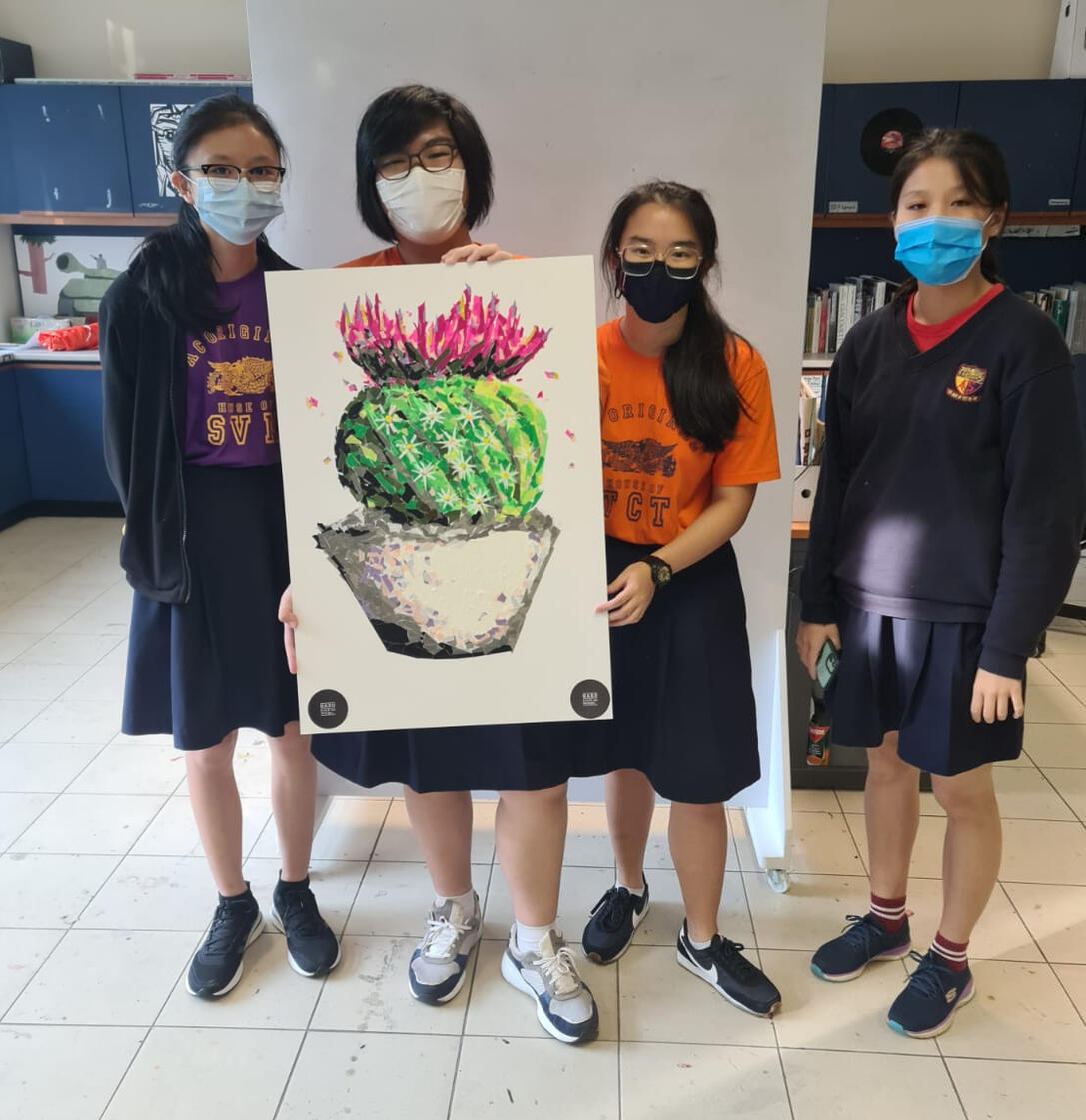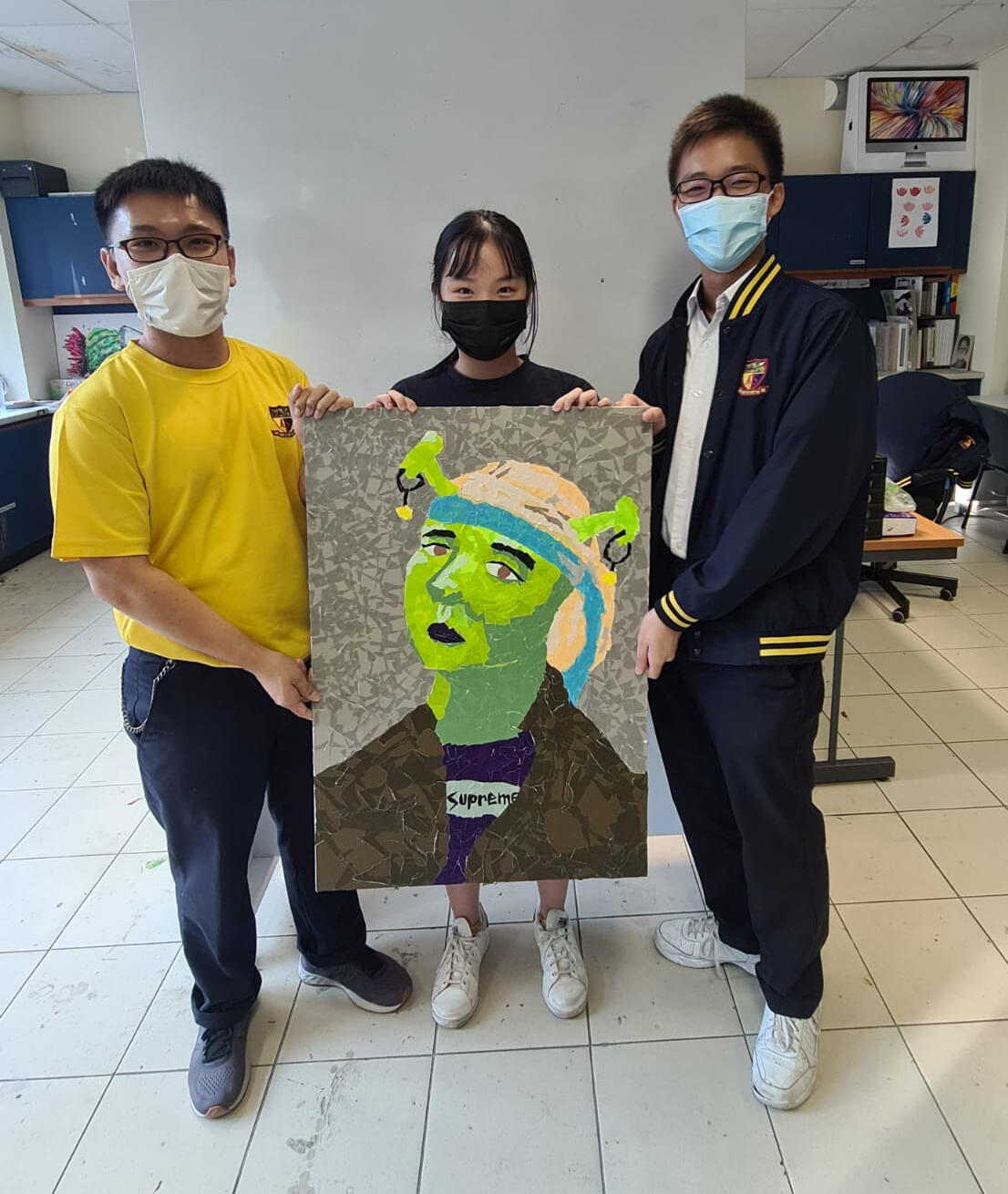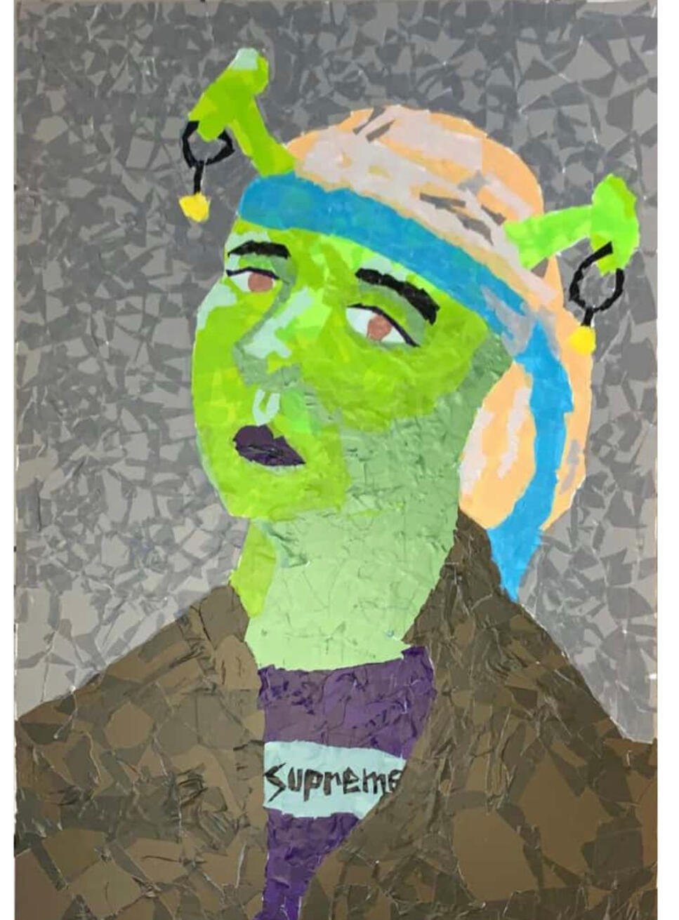 Inspired by Johannes Vermeer, the students decided to recreate the painting “Girl with a Pearl Earring”, but with a modern comedic twist. The work comprises numerous pieces of torn haru tape and pasted to create the shape of the subject matter. Elements of Pop Art, which is about making art accessible to all, can be observed in this work, where Shrek, a fictional character, becomes the main subject matter. This work is characterised by humour and created from the basis that art does not necessarily have to have a deep meaning behind it.