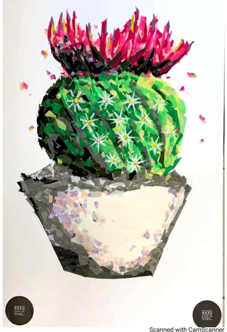 With the use of scissors, tweezers and other equipment, the team made use of refined techniques to create the subject matter, a Parodia Magnifica. The use of multiple layers, various tonal values and colours creates a perceived depth, attributing to the sense of realism observed in the work. The colours, magenta and forest green are contrasting, drawing attention to the textures in the work.