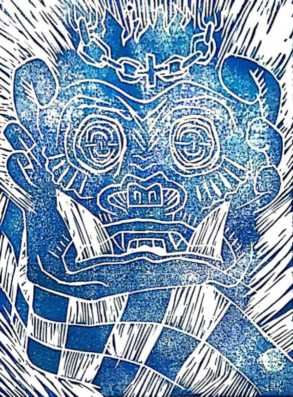 Owen’s lino print is based on Balinese legends and heritage. The print depicts the beast “Barong” being emphasised over a chaotic background. The checkered flag, which is also commonly seen in Balinese art, contrasts the background with its structured and cubic silhouette.