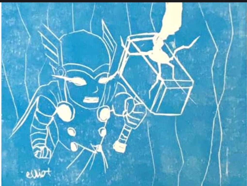 Elliot took inspiration from his favourite childhood superhero, Thor, The God of Thunder, from the Marvel Universe. Based on his own memory of the character, he created his work in chibi style, an art style popular in Japanese culture. The choice of colour creates a contrast between the striking white lightning and the azure blue sky. The simplistic design of Elliot’s work demonstrates his fondness and nostalgia for Thor.